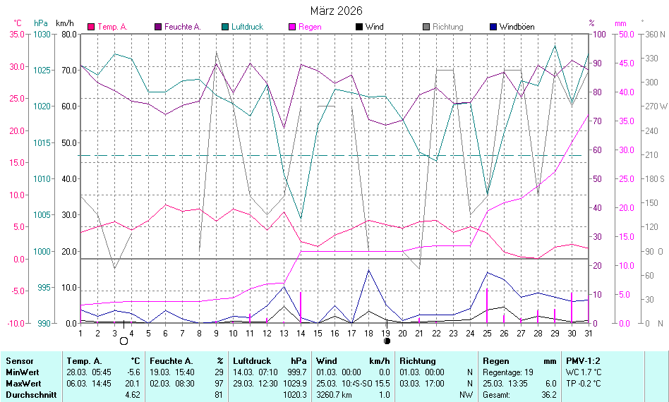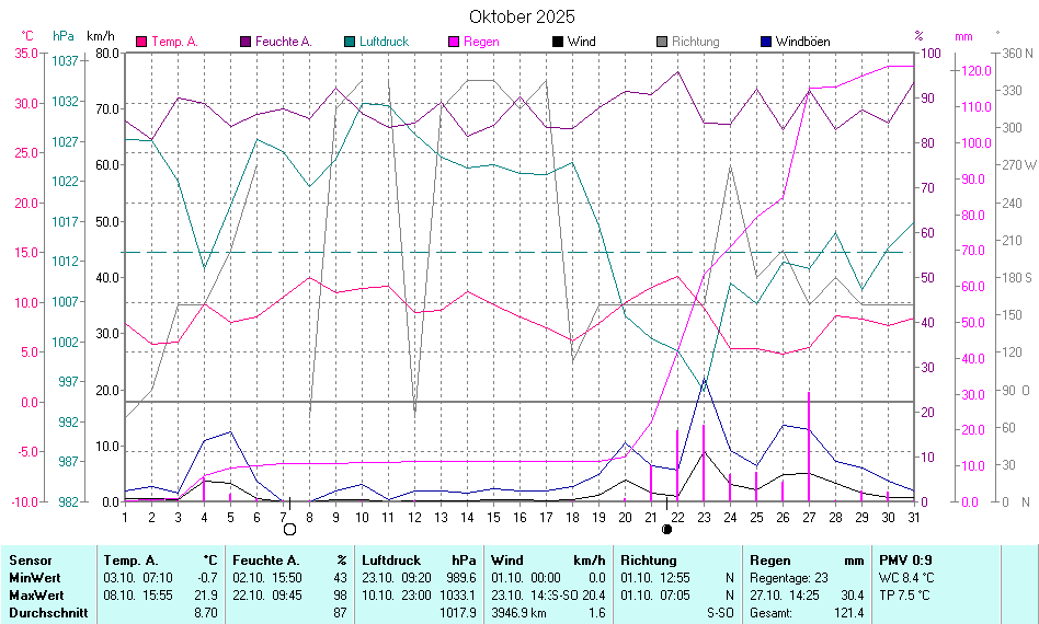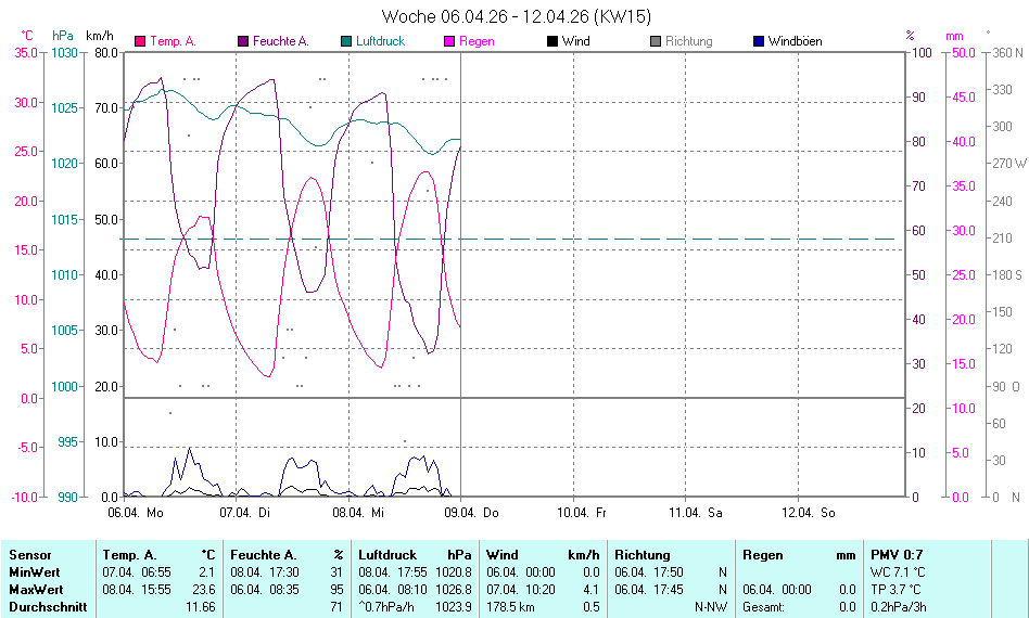| Die dargestellten Werte repräsentieren die Daten der letzten 24 Stunden! Der Luftdruck ist auf Meereshöhe bezogen! |