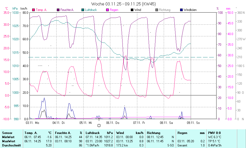 Max.(14:00) O 11,3 km/h (2 Bft) |